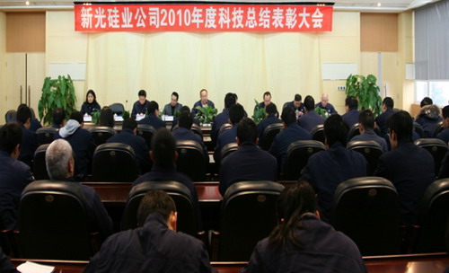 “科技就是生产力。”新光硅业公司自成立以来,高度重视科研开发和科技创新。2011年1月6日,公司召开2010年度科技大会,乐山市科技局领导、公司领导、专家、各部门负责人、科研课题组负责人以及公司科技人员参加了会议,会议由公司副总经理钟志翔主持。