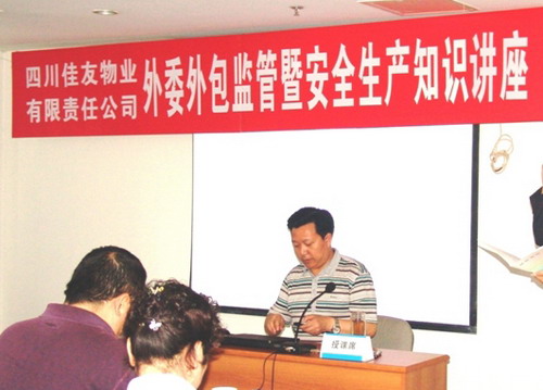 为全面贯彻川投集团安委会2011年第二次例会精神,坚持“安全第一,预防为主,综合治理”的方针,提高员工安全生产意识,落实佳友公司董事长李文志在第二届八次董事会上提出的“监管到位,责任履行到位,安全才有保障”的安全生产工作要求,营造人人讲安全、处处有安全、事事保安全的浓厚氛围,提高佳友公司各级安全生产管理人员的履职能力,做到知法懂法、依法管理,在以“安全责任,重在落实”为主题的2011年“全国安全生产月”活动开始之际,佳友公司高度重视安全生产,精心策划,特邀到国内知名安全生产法规专家、四川省安全生产监察执法总队总队长周彤,于2011年6月1日莅临川投大厦宣讲“外委外包监管暨安全生产知识”,对佳友公司所属八个项目的负责人、部门副主管(或领班)以上44名管理人员作了安全生产知识专题培训。