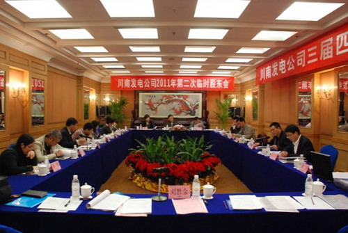 2011年11月16日,四川泸州川南发电有限责任公司(以下简称公司)2011年第二次临时股东会、三届四次董事会在四川成都召开。会议由川投集团公司副总经理、公司董事伍康定主持。公司副董事长王文琦,董事郭爱国、张维群、肖群英、李胜章、唐得旗参加会议。监事会主席任明霞,监事郑世红、黄泰慧及公司相关管理人员谭先明、谢伟平、黄松、刘云戈等列席会议。