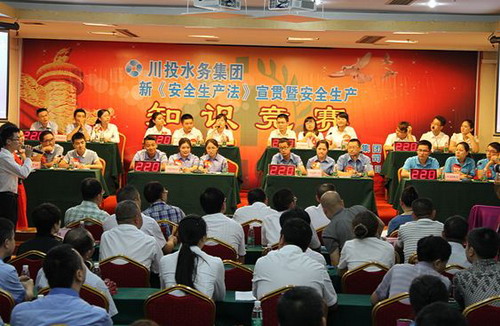 6月是全国安全生产月。为深入贯彻落实2015年安全生产月“加强安全法治,保障安全生产”主题精神,2015年6月24日上午,川投水务举办在宏源公司11楼多功能厅举办了新《安全生产法》宣贯暨安全生产知识竞赛活动。川投集团安办副主任曾明、川投水务综合部经理杨志刚、安全服务监察部经理马玉斌、射洪县安监局副局长赵杰等领导出席知识竞赛活动。川投水务各子公司主要领导带队参加比赛。