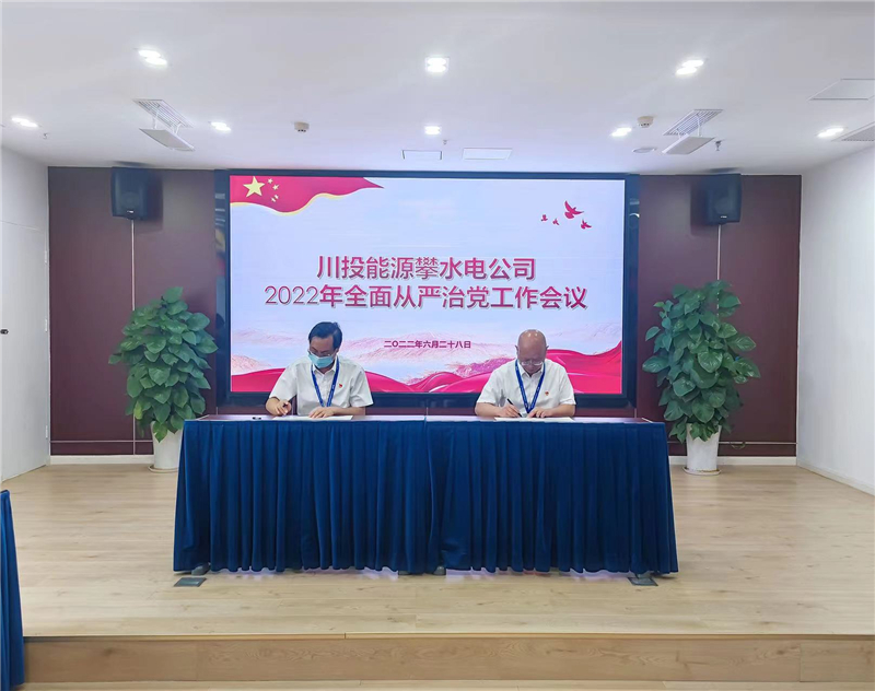 会议首先由党总支委员、董事会秘书、工会主席邓勇传达学习了川投能源党委书记、副董事长、总经理杨洪在川投能源2022年加强党的领导、全面从严治党工作会上的讲话,杨锐汇报了2022年上半年纪检工作总结及下半年工作打算,公司党总支委员、领导班子成员汇报了半年来“一岗双责”履责情况,川投能源副总经理、攀水电公司党总支书记、董事长徐孝刚与领导班子成员代表财务总监王俊森现场签订了《党风廉政建设责任书》。